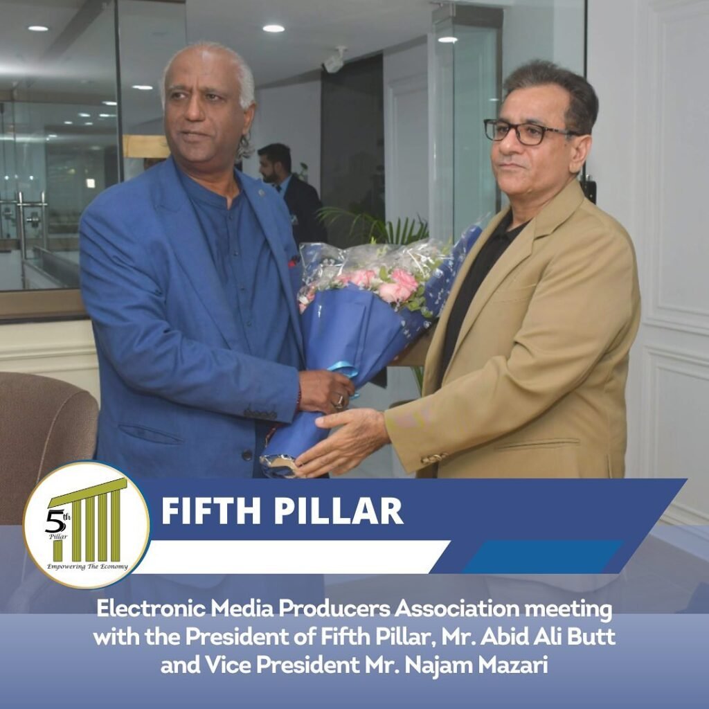 ففتھ پلر پاکستان اور الیکٹرانک میڈیا پروڈیوسر ایسوسی ایشن کی ملاقات گزشتہ روز امانہ مال میں ففتھ پلر کے دفتر میں ہوئی جس میں میڈیا کے نامور پروگرامز کے پرڈیوسرز نے شرکت کی ملاقات میں صدر ففتھ پلر، عابد علی بٹ، نائب صدر، نجم مزاری، ممبرز کور کمیٹی محمد علی اور ڈائریکٹر امریکن لائسٹف سکولز بھی موجود تھے۔